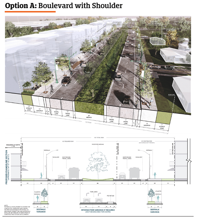 The name change from Evangeline Thruway to Evangeline Boulevard is a big deal and should be used as a way to design the details to make that change reality and not just a change in a name. First, slow traffic down and save money on the new Evangeline boulevard by making lanes 10 feet wide, not 11 feet plus 1.5 feet of gutter (12.5 feet!!). Camellia Boulevard is a great example of how wide lanes get faster traffic than the posted speed where almost no motorist follows the posted speed limit. Further slow traffic by planting a row of trees against the back of curb. This gives motorists a subliminal cue of speed through the repetitive object in their peripheral vision. This also separates cyclists and pedestrians from car traffic (see our suggested typical section and plan). This also makes it much nicer as a pedestrian or cyclist with shade in our hot climate.