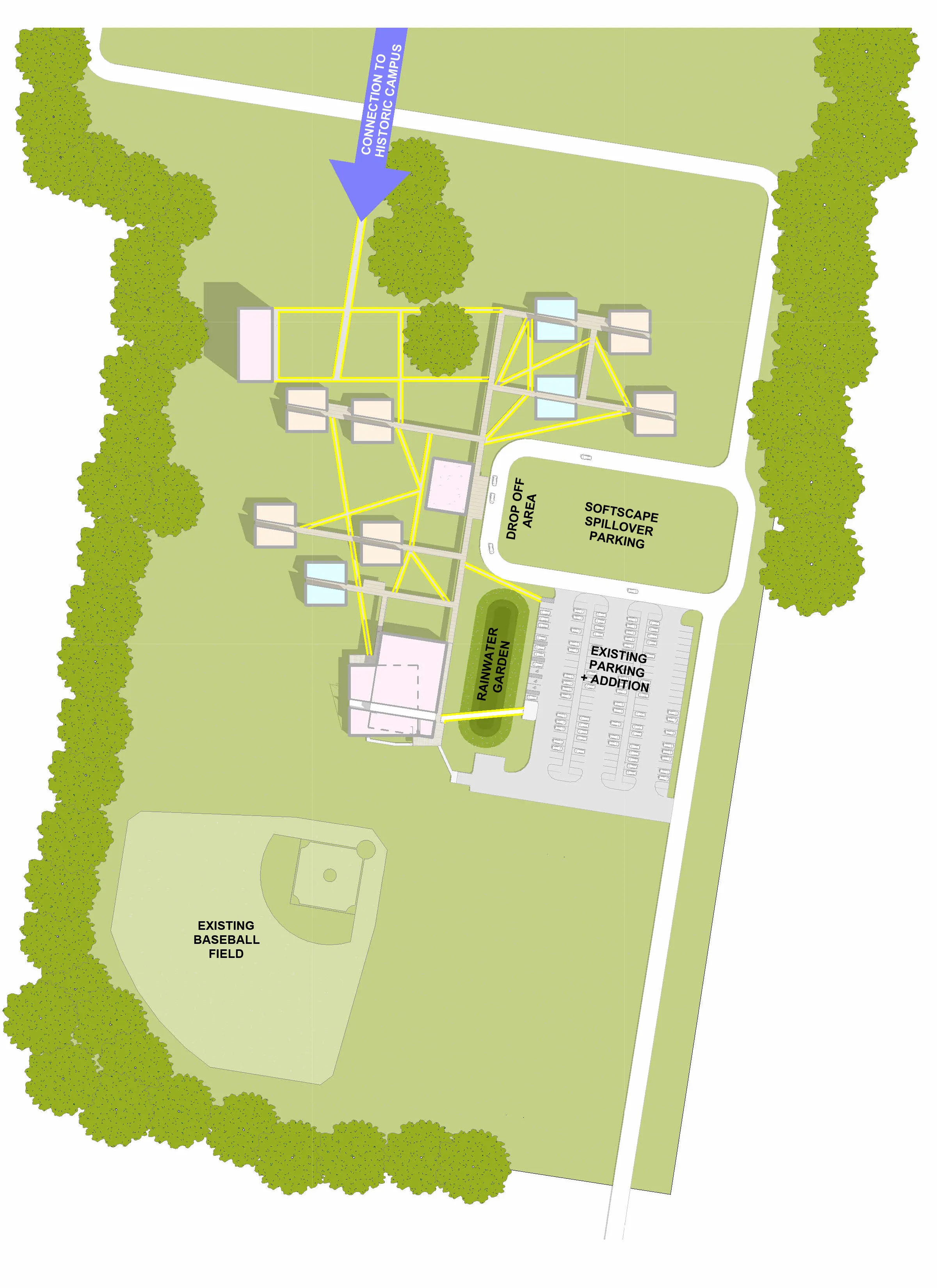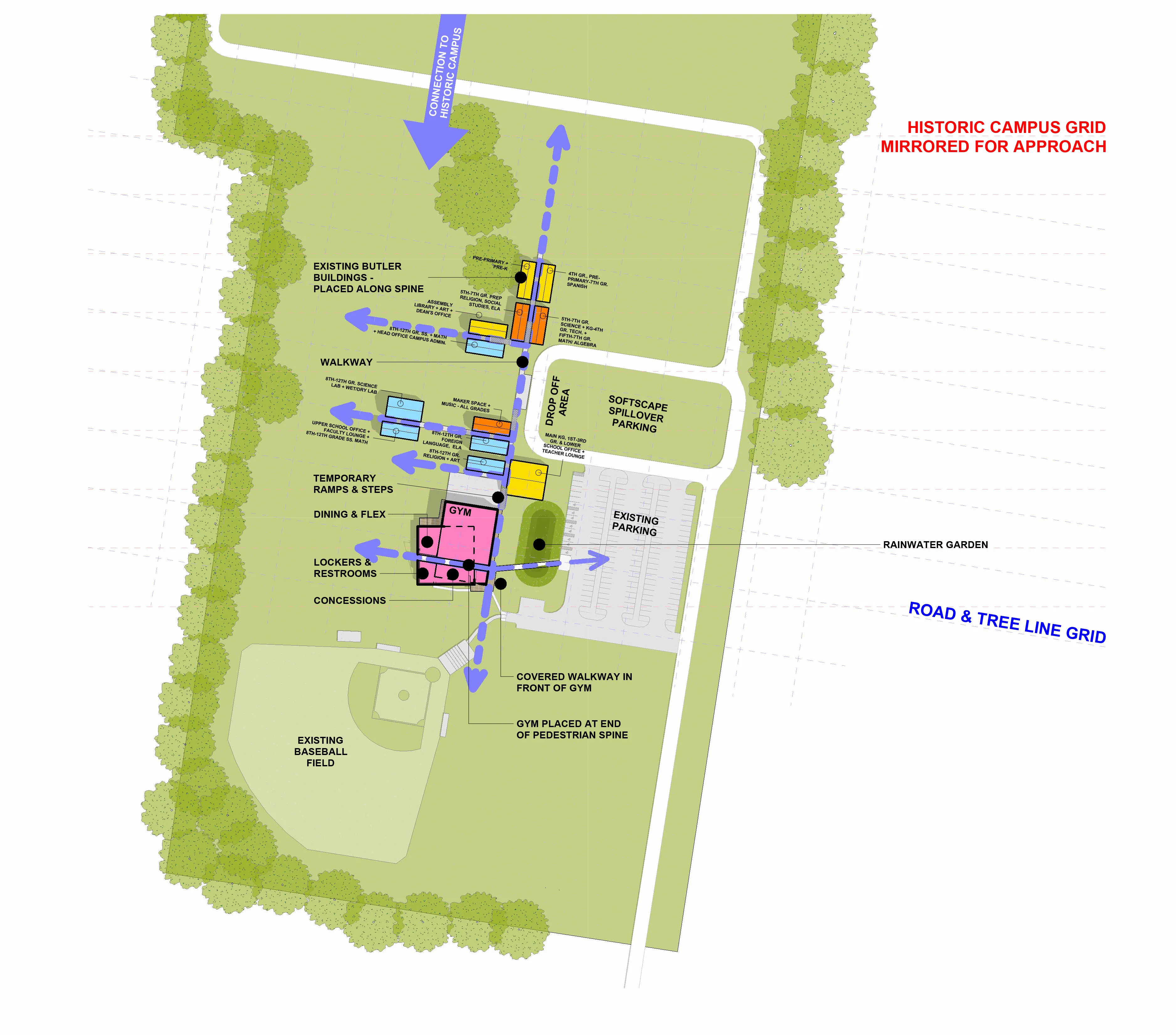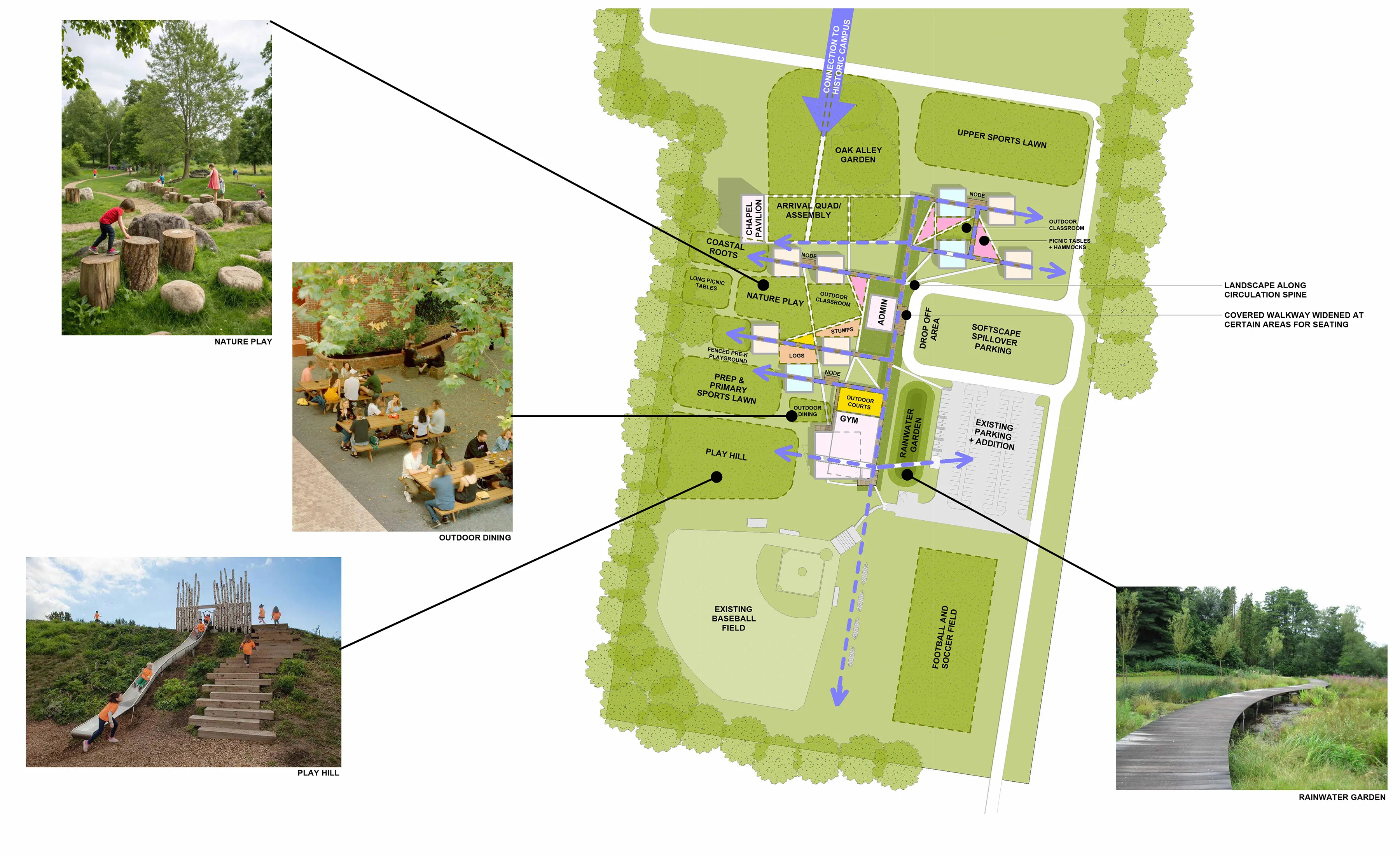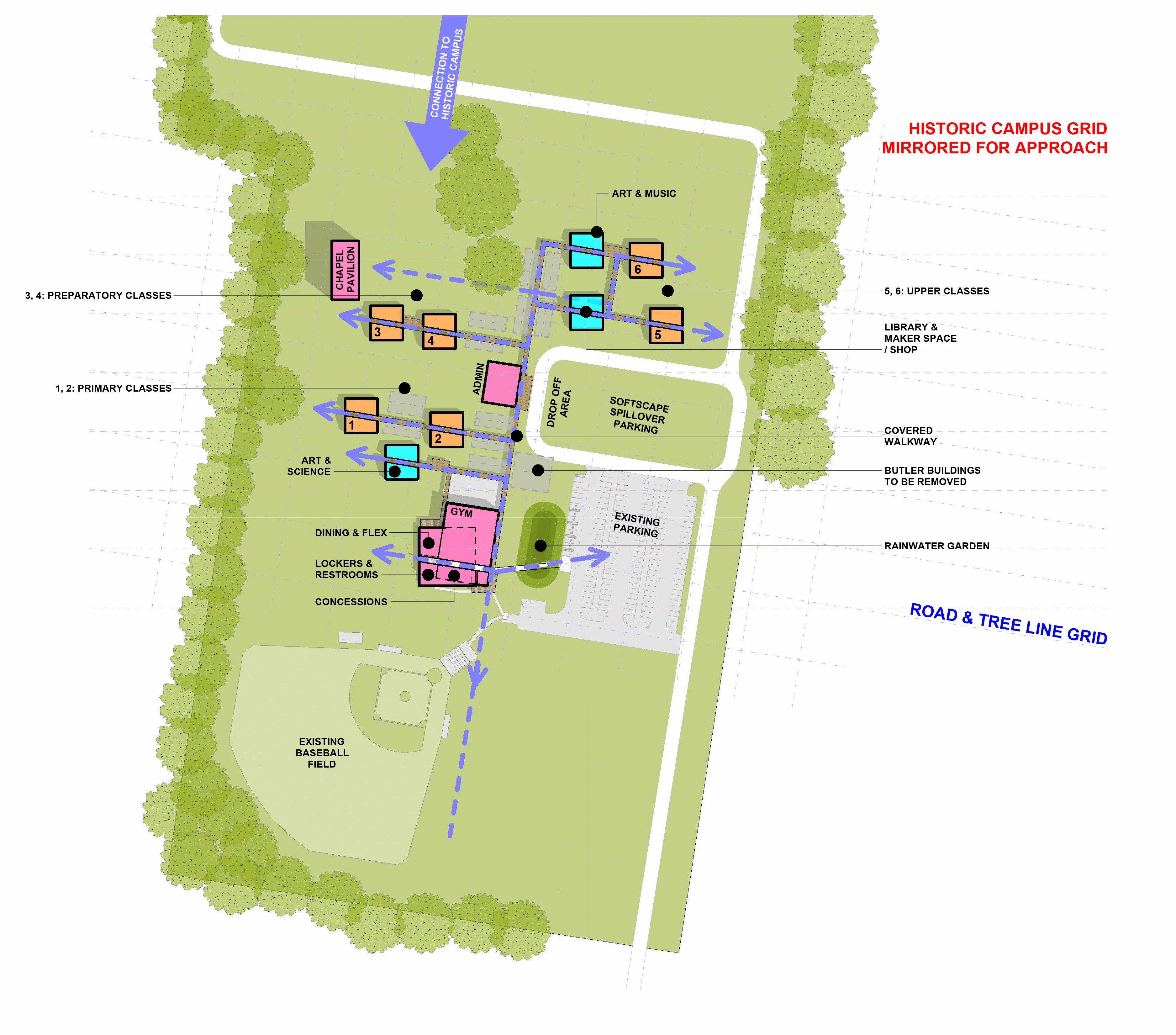 1-2 PRIMARY CLASSES, 3-4 PREPARATORY CLASSES, 5-6 UPPER CLASSES, 7 ART & MUSIC, 8 LIBRARY & MAKER SPACE, 9 ADMINISTRATION, 10 ART & SCIENCE, 11 CHAPEL PAVILION, 12 GYMNASIUM, 13 DINING & FLEX, 14 LOCKERS & RESTROOMS, 15 CONCESSIONS, 16 PLAY HILL, 17 PREP & PRIMARY SPORTS LAWN, 18 OUTDOOR DINING, 19 OUTDOOR COURTS, 20 LOGS, 21 FENCES PRE-K PLAYGROUND, 22 STUMPS, 23 LONG PICNIC TABLES, 24 NATURAL PLAYGROUND, 25 OUTDOOR CLASSROOM, 26 PICNIC TABLES & HAMMOCKS, 27 COASTAL ROOTS, 28 ARRIVAL QUAD/ ASSEMBLY, 29 OAK ALLEY GARDEN, 30 UPPER SPORTS LAWN