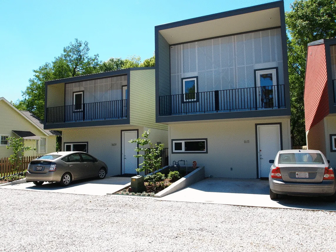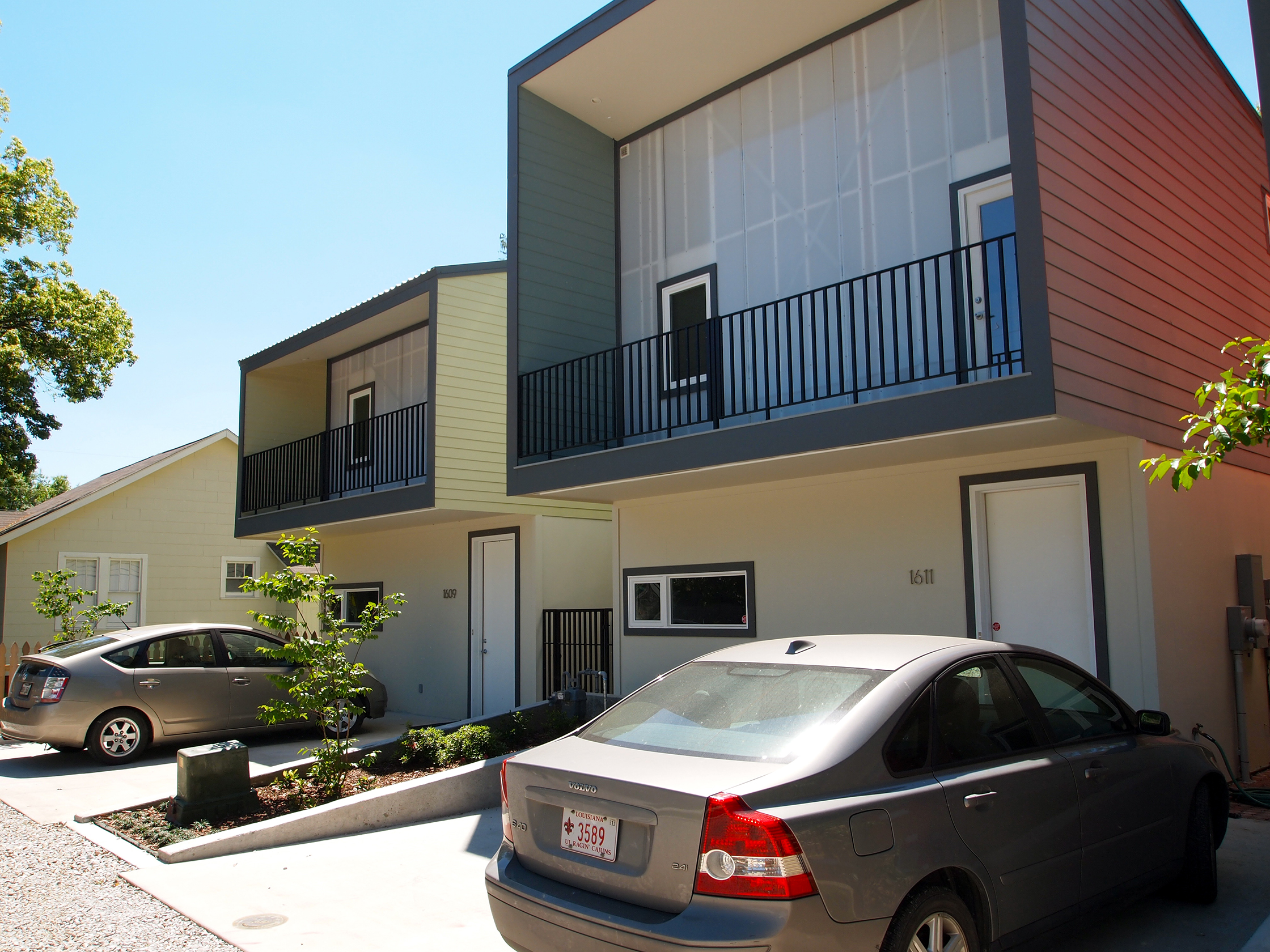 These four eco-friendly houses in Lafayette, Louisiana are designed with a local urban Creole typology in mind while referring to the craftsmen houses in their neighborhood. Sculpturally designed, four “tubes” sit upon a continuous urban wall, a historic feature in Louisiana cities. Each one rhythmically alternates in shape, giving some variation beyond color and material. These “tubes” cantilever over the wall to create upper-story galleries, an undeniable part of Louisiana historic architecture.