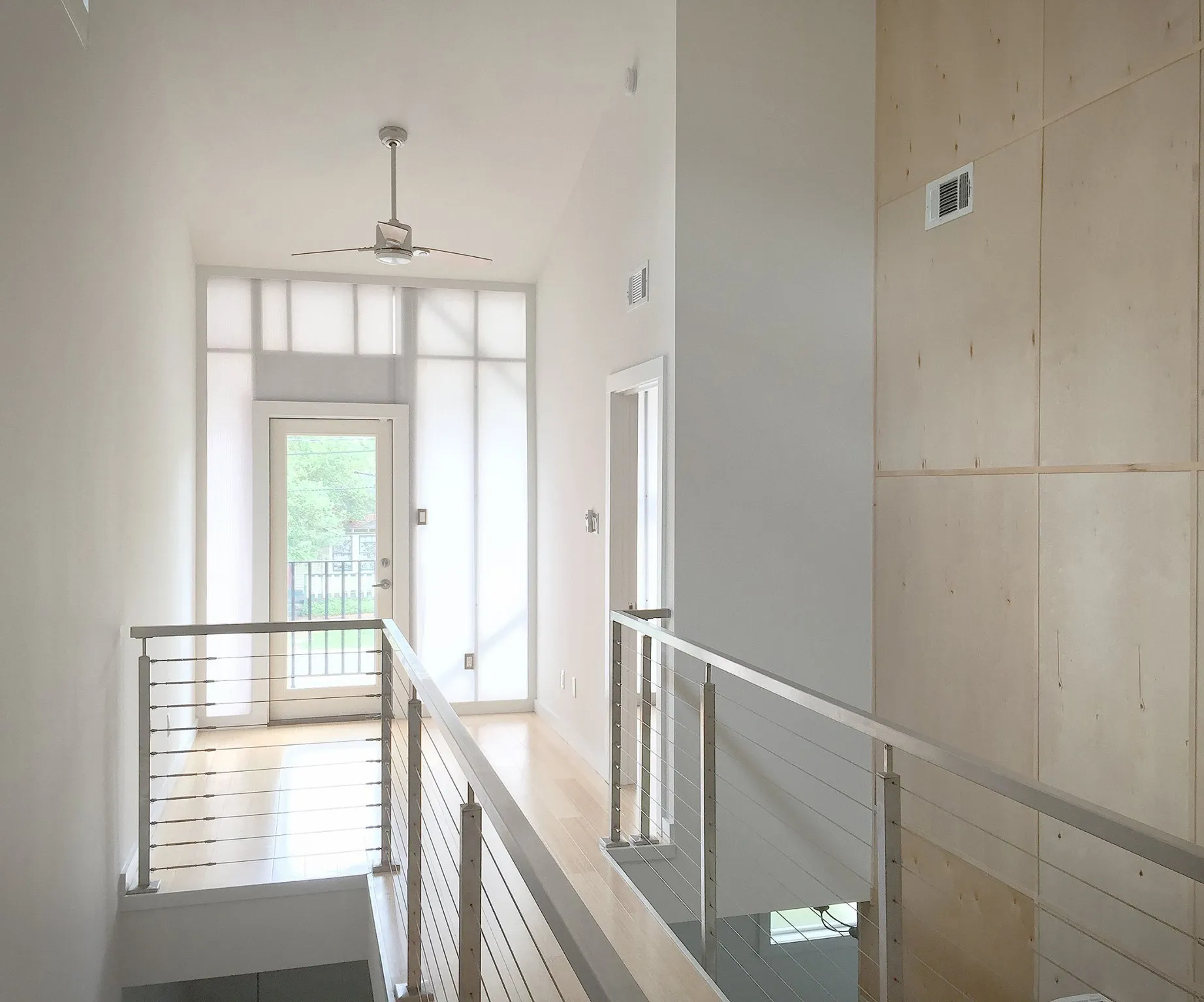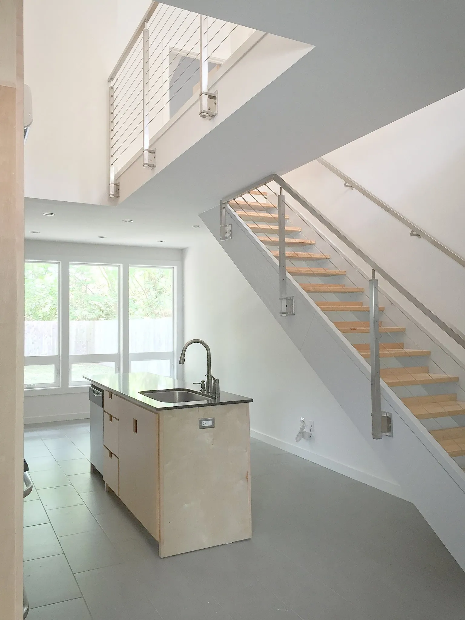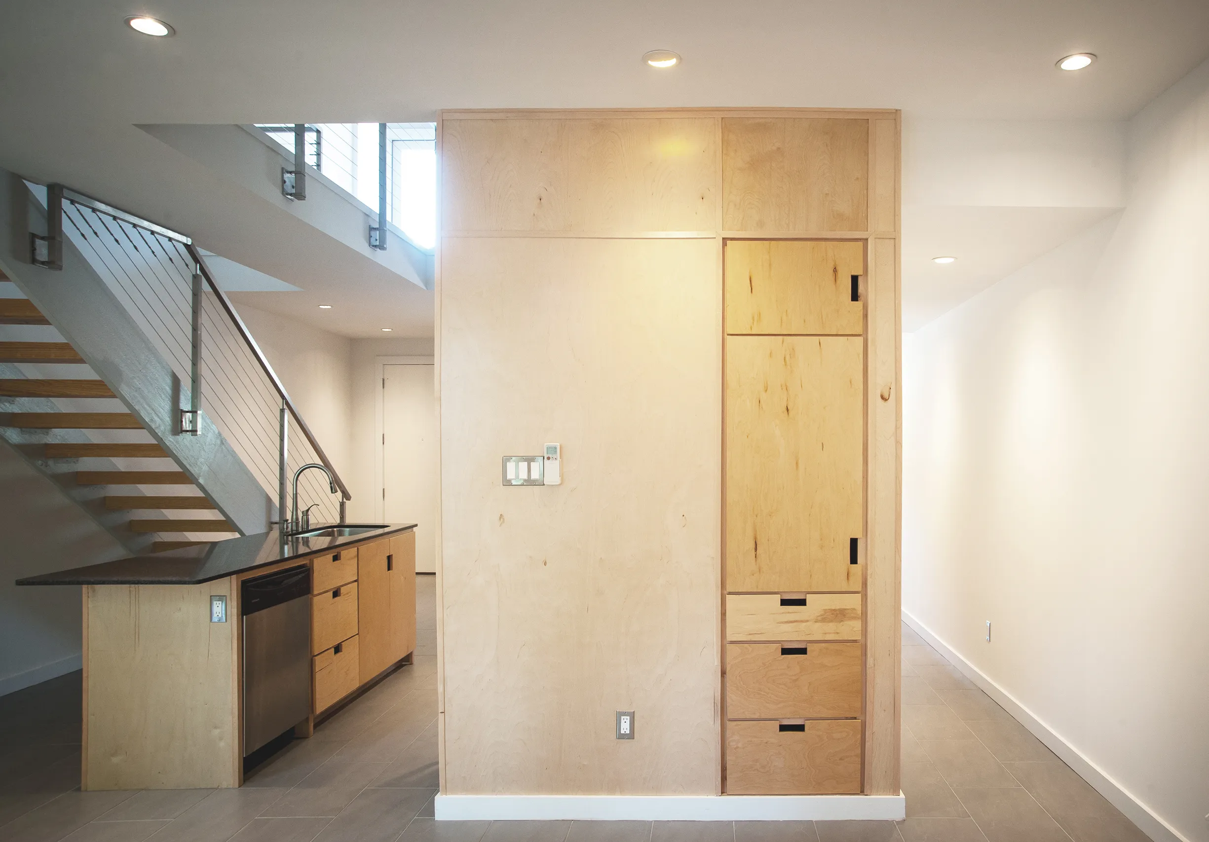 Set in a double-height space next to the open-riser stair, the kitchen becomes the focal point of the house, the modern-day “hearth” in any Louisiana home as the most social place for entertaining. The cabinets of the kitchen “continue” up the 24 foot high wall as matching wood paneling making a sort of chimney in the center of the house.