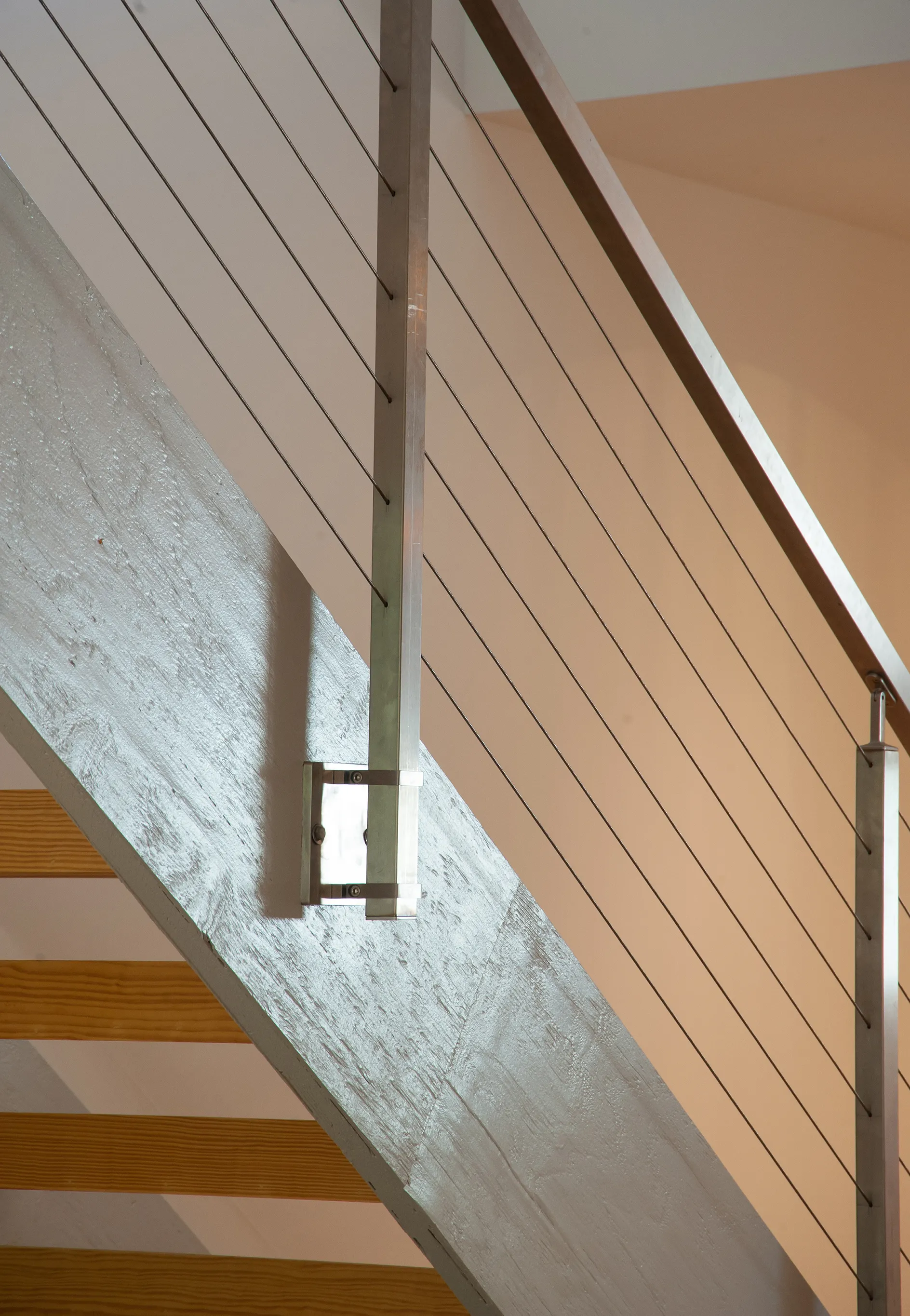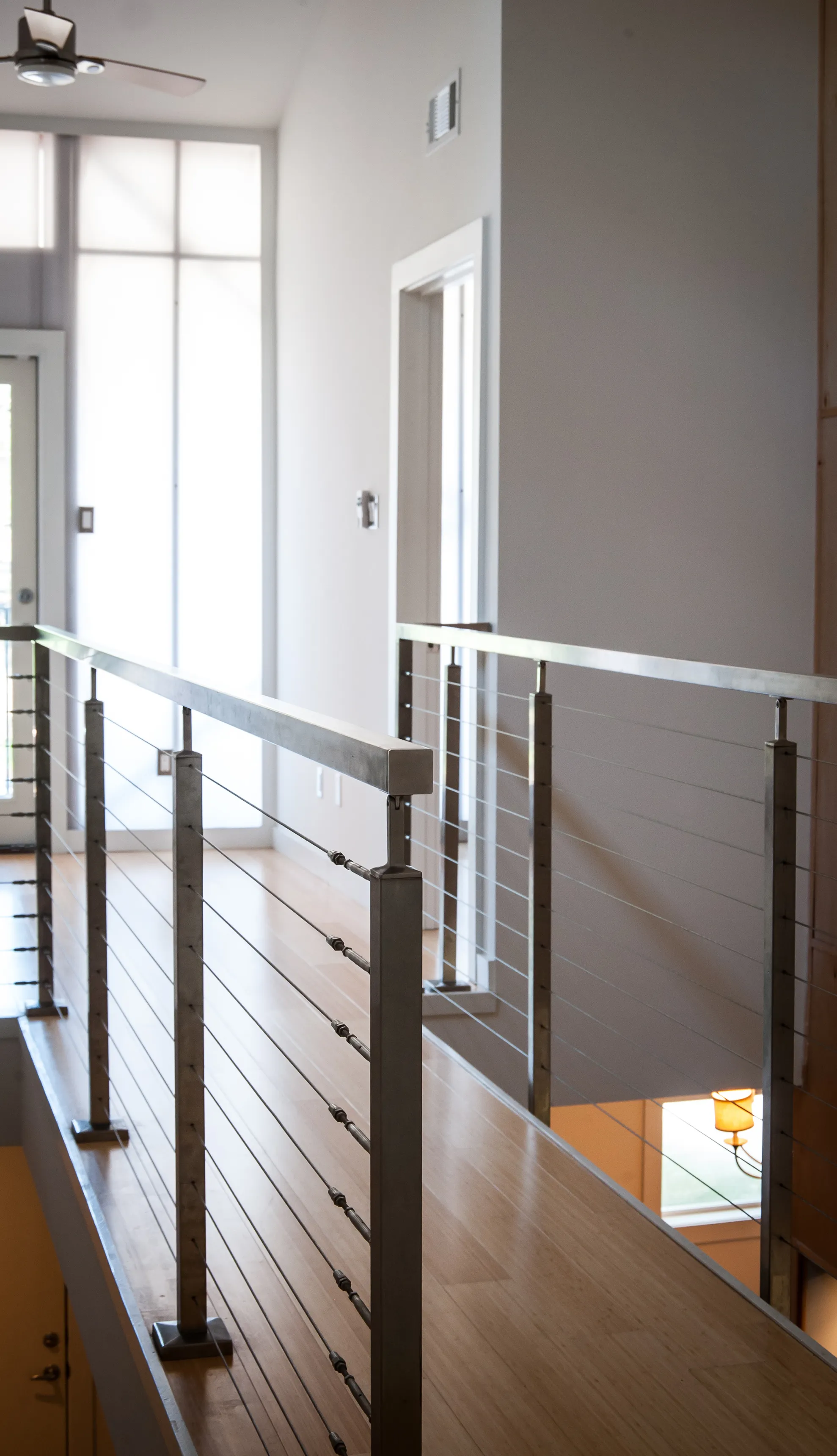 The light from a clerestory window above, as well as the polycarbonate wall in the study, casts light down the double-height space, over the stair, and into the kitchen. The double-height space also helps to create stacked ventilation for passive cooling on cool days or evenings.