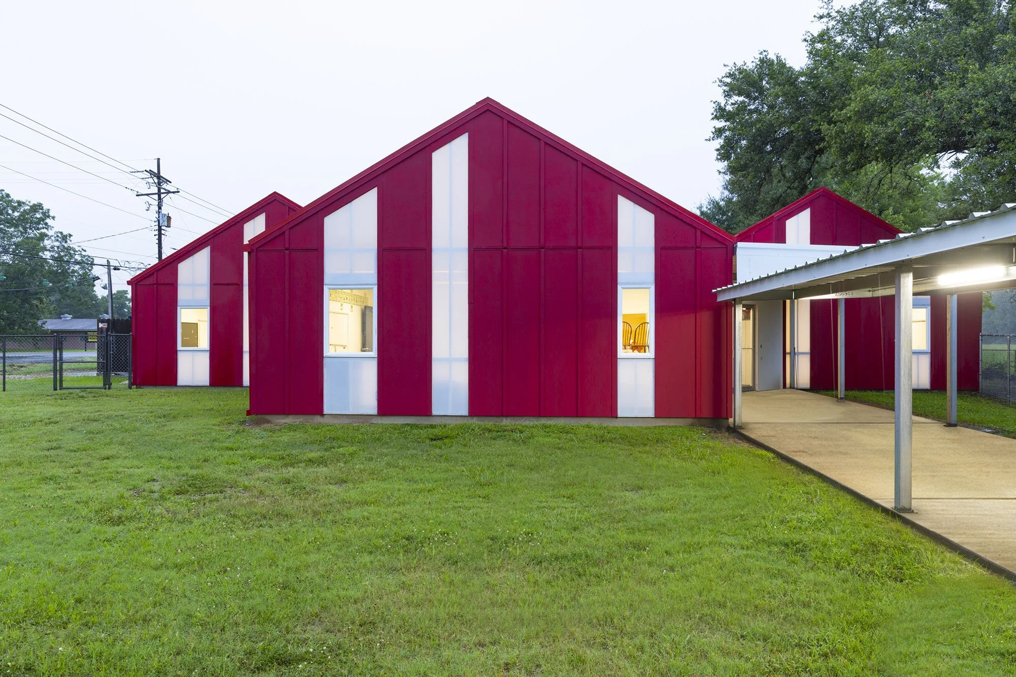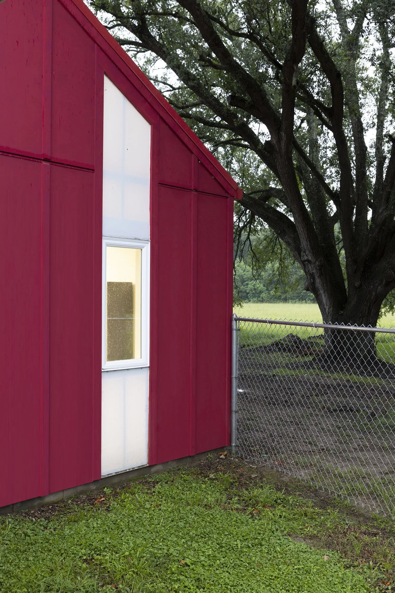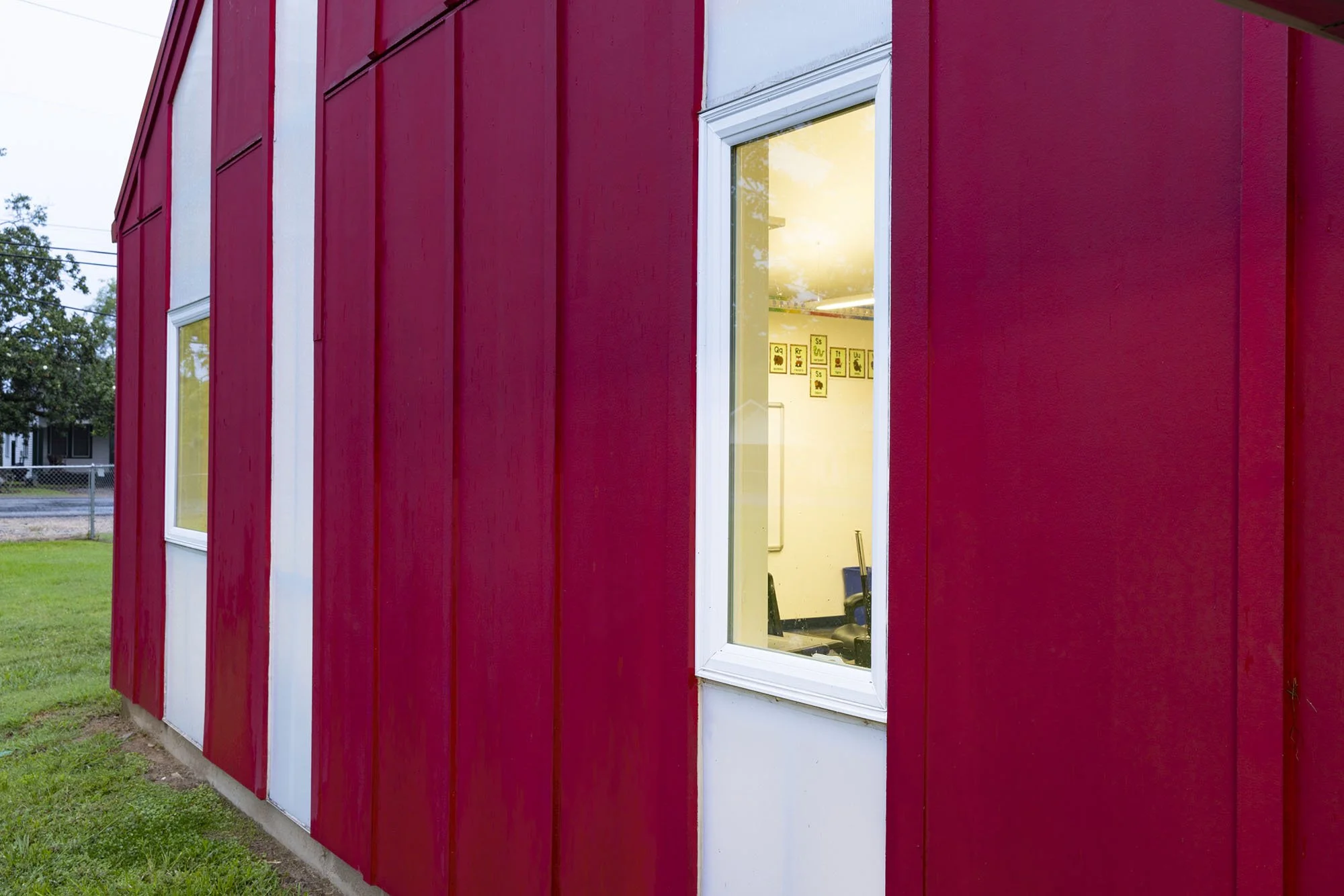 The building is clad in a rainscreen to provide enhanced protection for the building’s interior from South Louisiana’s wet climate by creating an ‘umbrella’ effect on the building envelope. Wood-composite panels and battens create a rhythm that walks along the facades of the classrooms. This plays off the board-and-batten cladding commonly encountered on barn buildings in the area.