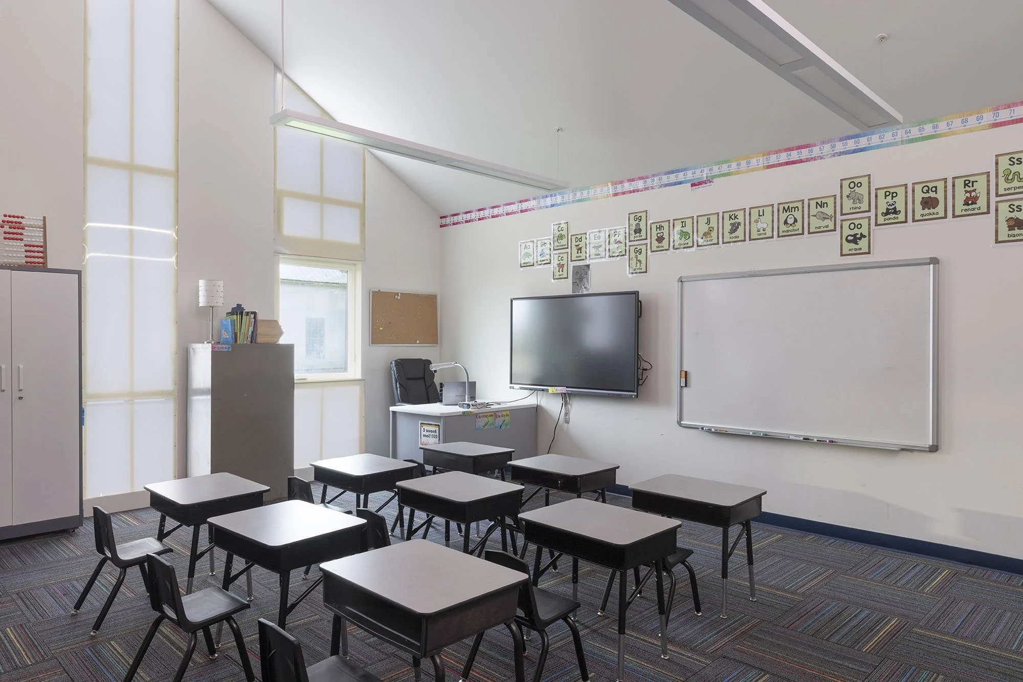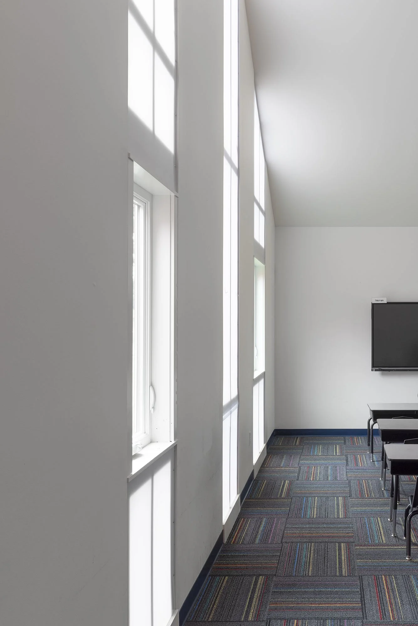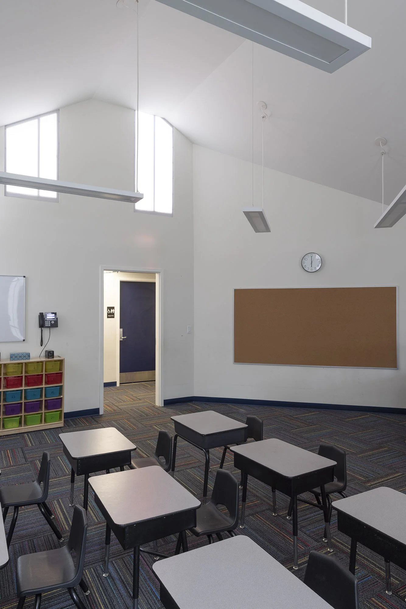 Service spaces, such as a central corridor, restrooms, offices, storage, and custodial spaces, connect the classroom spaces. A covered walkway (visible in photos) connects this addition to its original campus in the former church building.