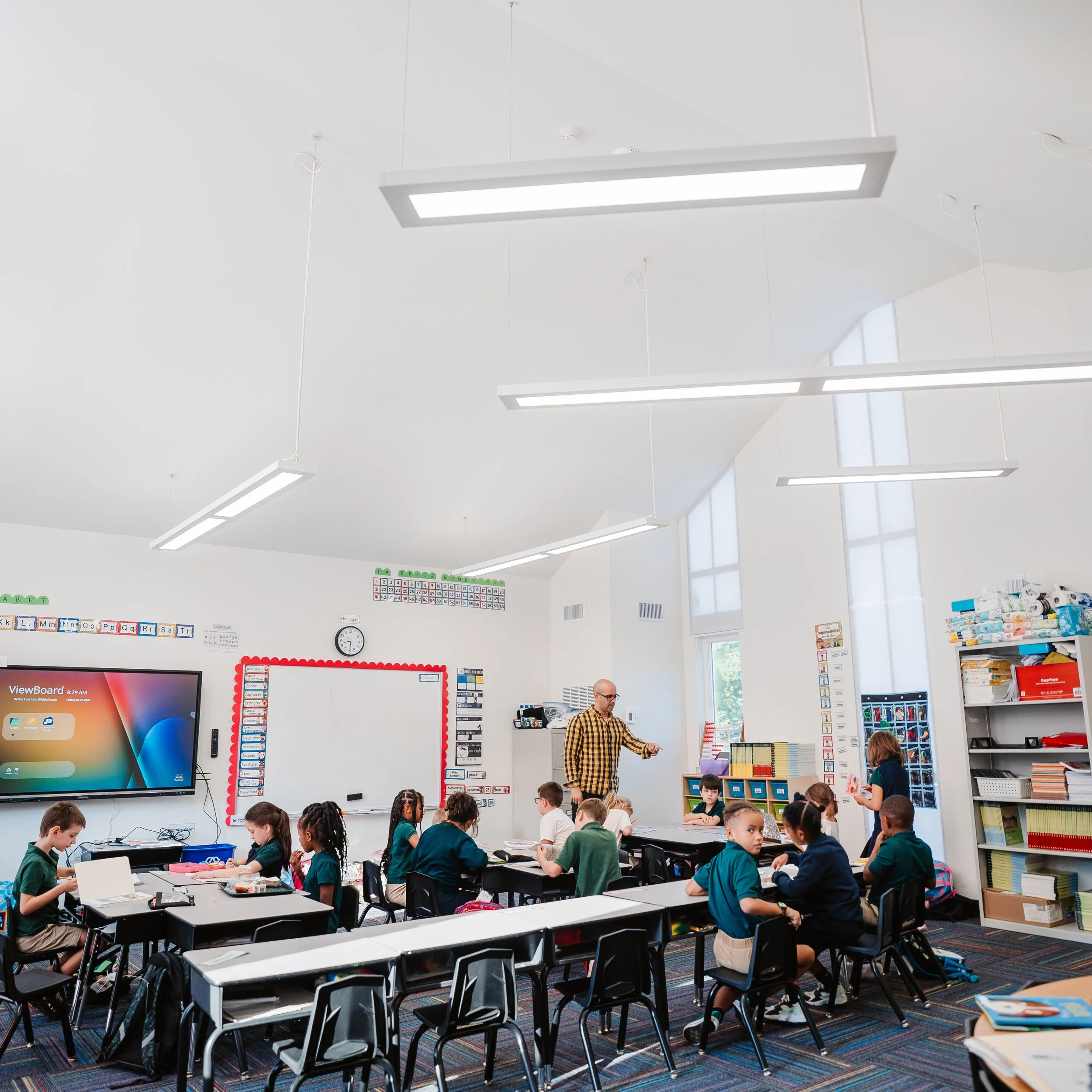 The simple classroom volumes feature cathedraled ceilings below the gable roofs, enhancing the sense of volume throughout the interior spaces.