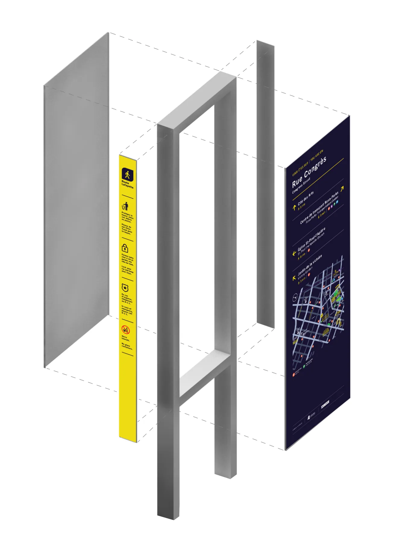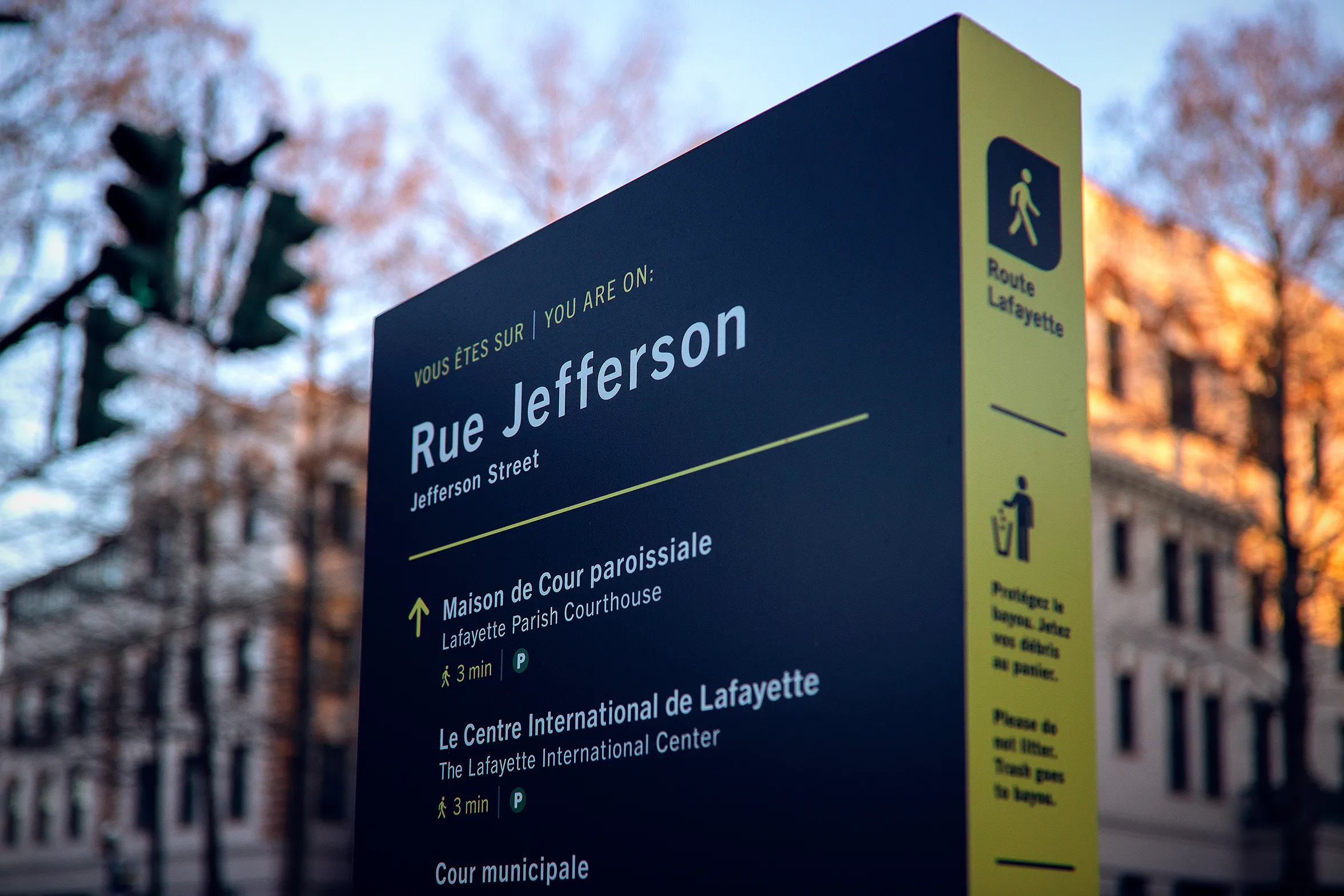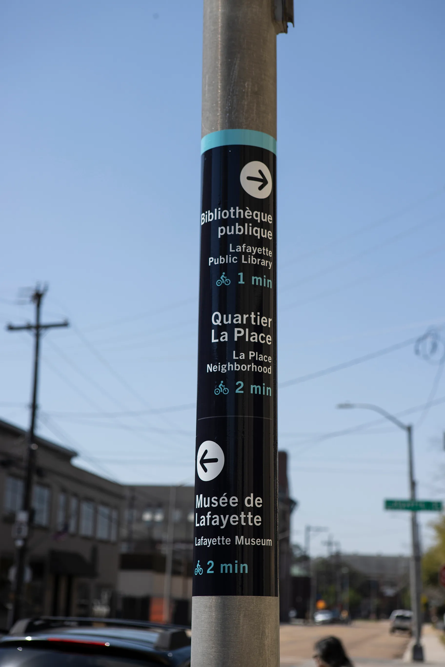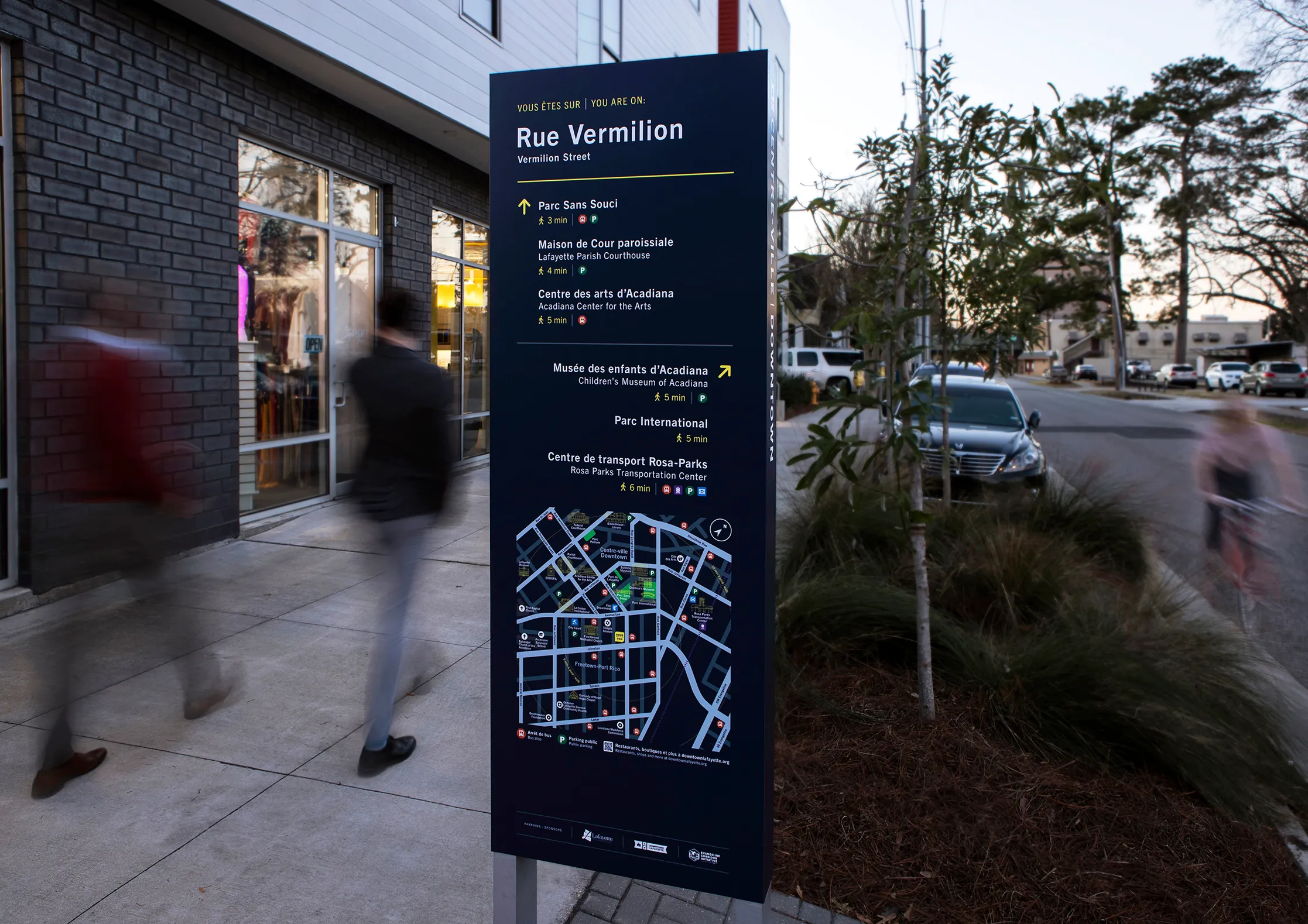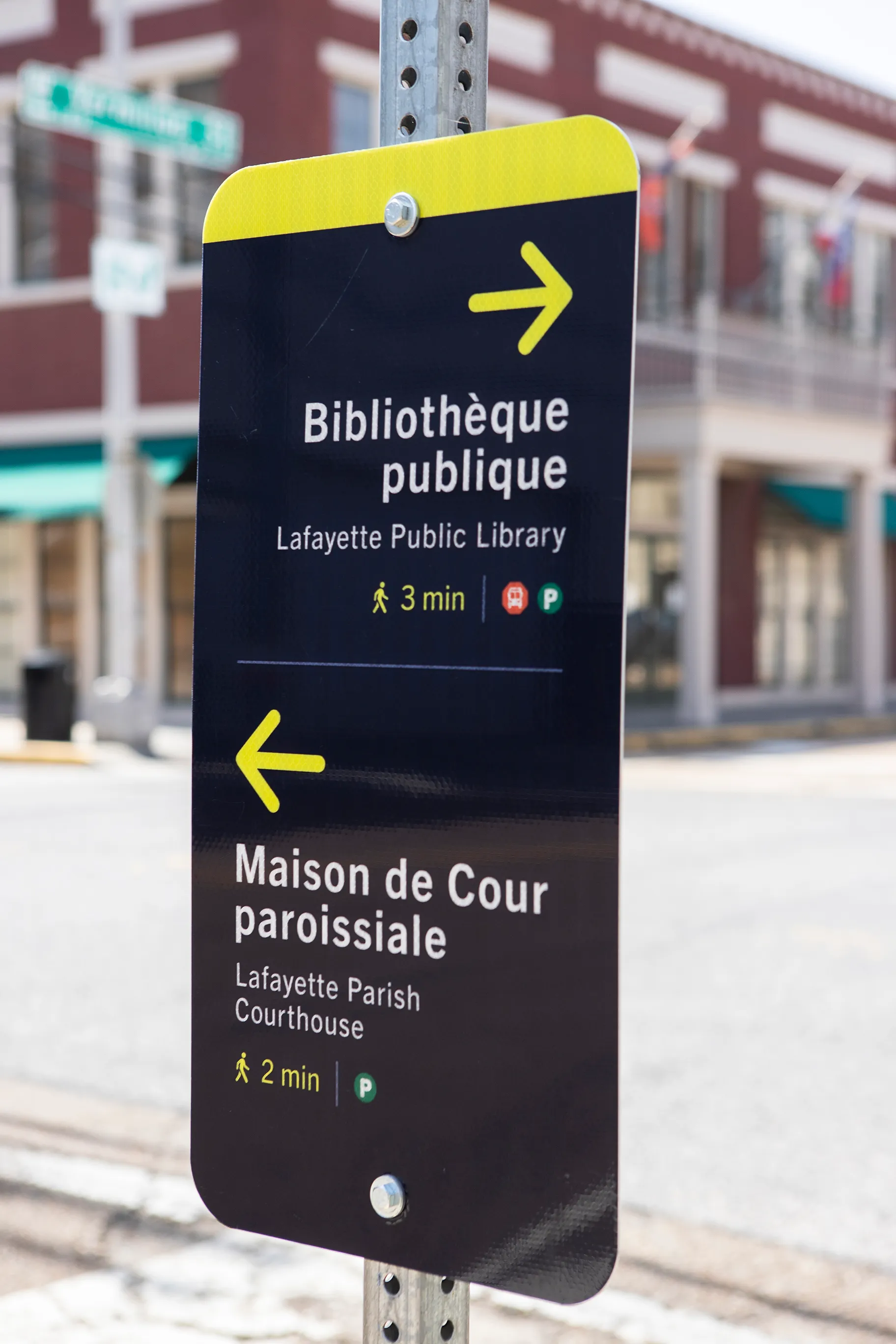 The Route Lafayette bilingual way finding system was designed to be inclusive of minority, indigenous or heritage languages while remaining easy to understand for all.