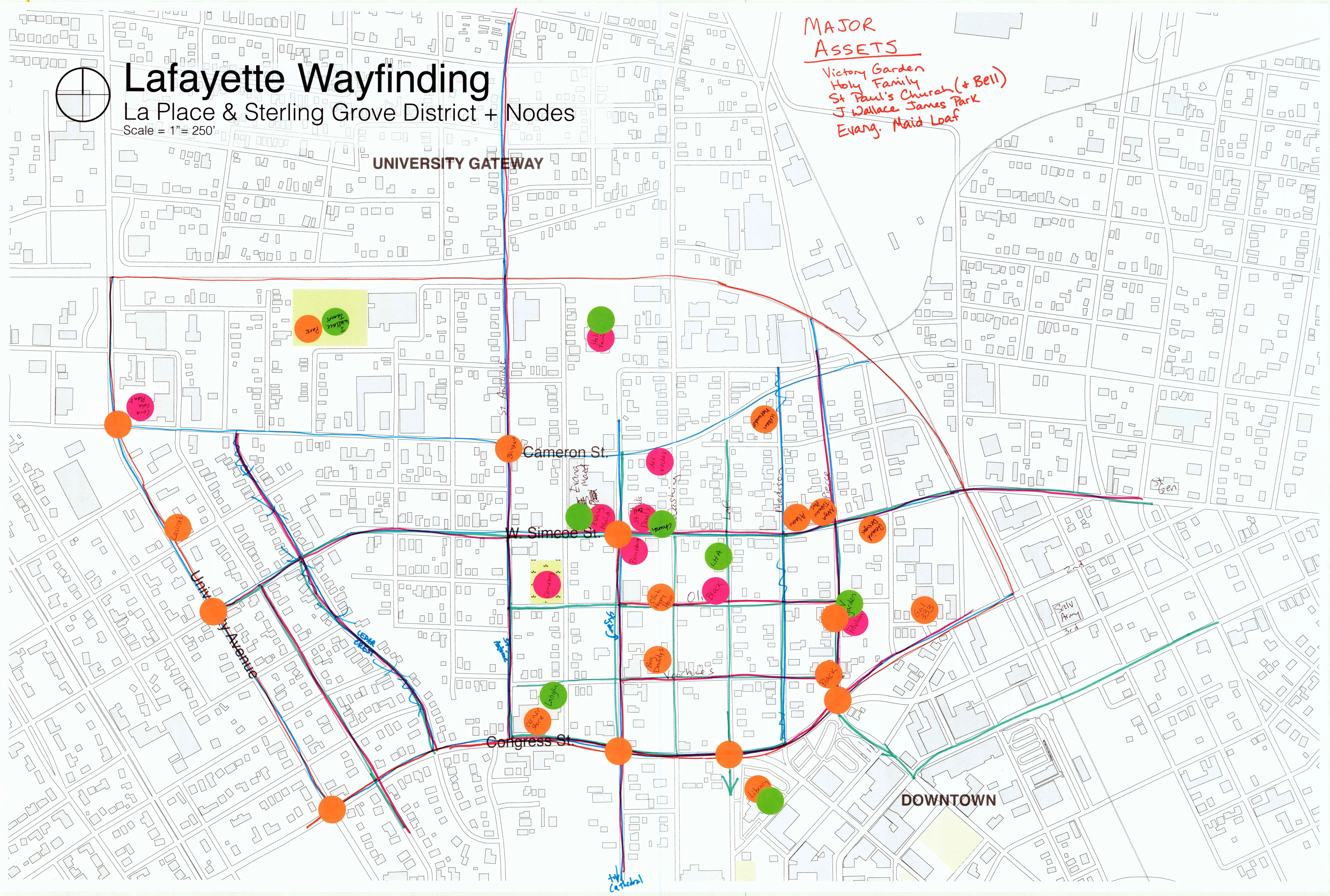Dots placed by members of the La Place community denote integral places in the neighborhood suggest locations of significance that should be included on the wayfinding maps.