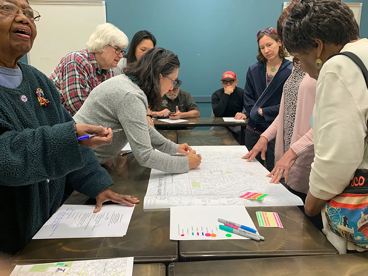 Members of the La Place Coterie gather for a charrette with SO Studio and provide their input on preferred pedestrian routes and locations of major assets throughout their neighborhood.