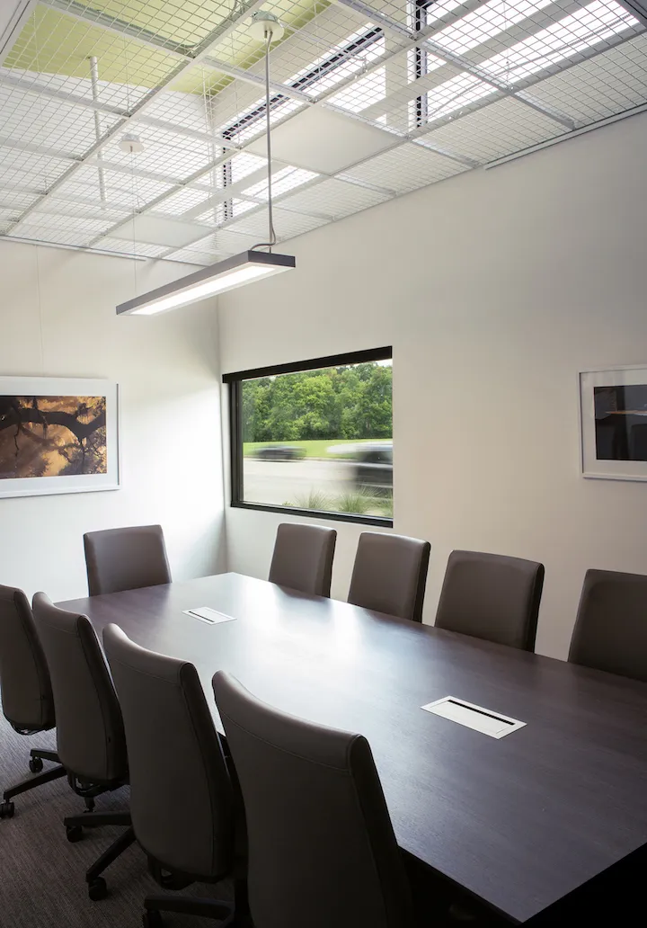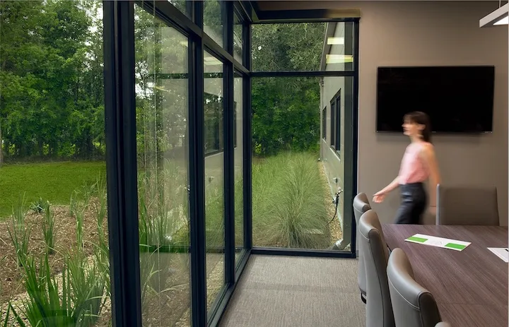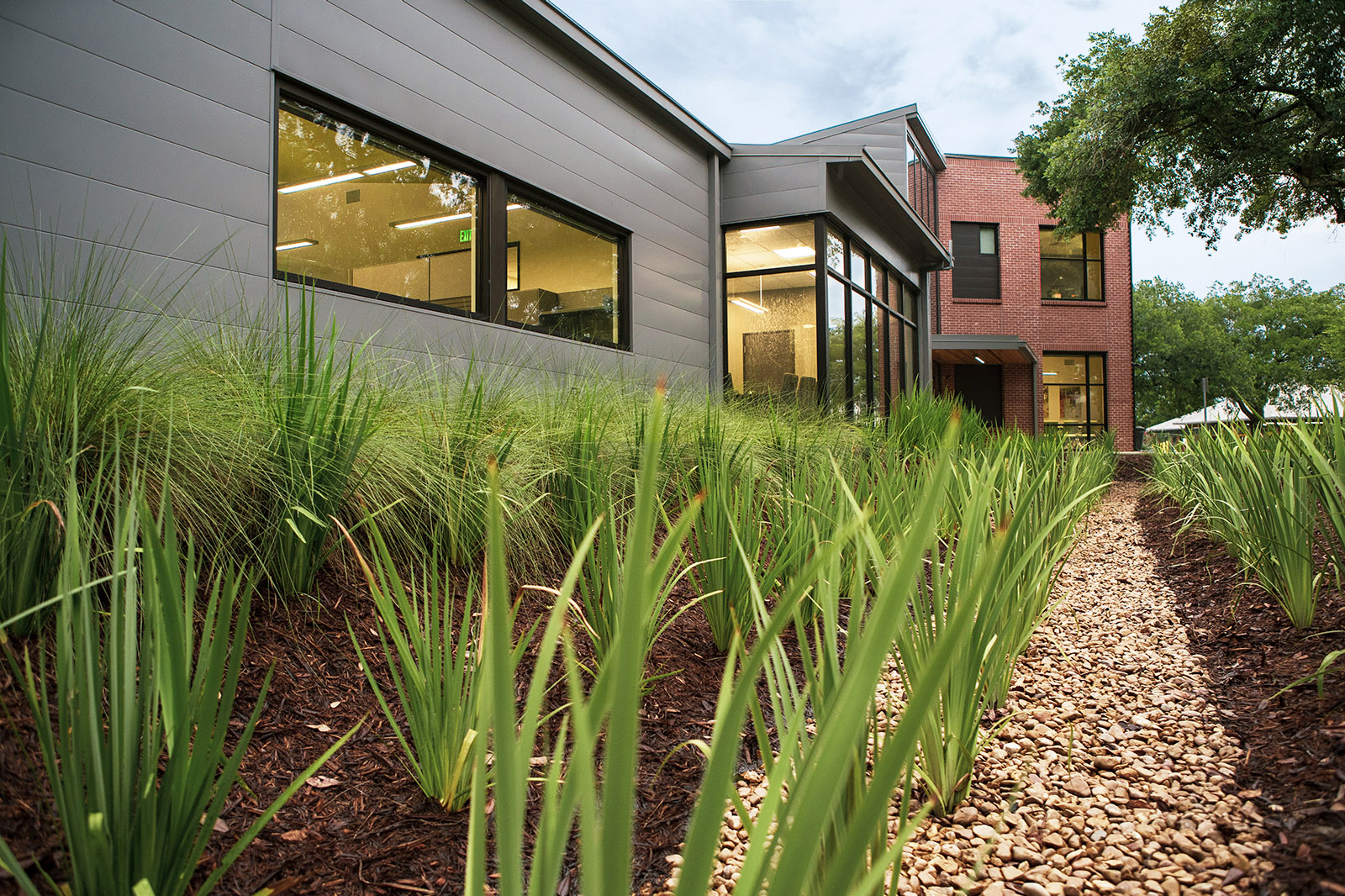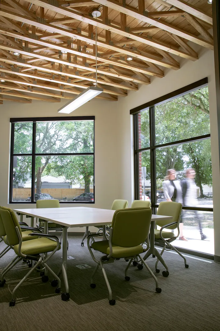 A Louisiana iris rainwater garden, used for detention, is incorporated on the inside of the block and is used as a feature in one of the conference rooms that is glassed in and hangs out over the sunken garden. The garden and conference room are covered by one of the preserved live oaks.