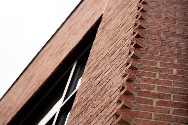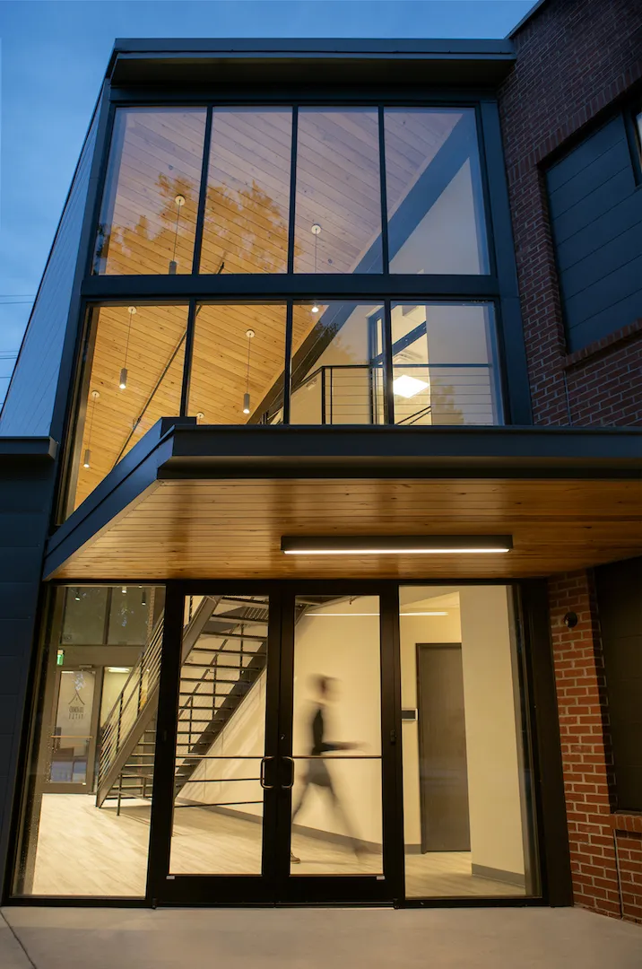 These two masses are then connected with a glassed-in entry that can be entered from both the parking lot on the interior of the block and from the street. The angle of the corner and the need to bring the building to the street forces an angle on the building that then carries throughout the design. This angle manifests itself from the moment of entry in the sculptural ceiling at the entry points from the sidewalk and the parking lot down to the pigeon hole detail where the brick turns the corners.