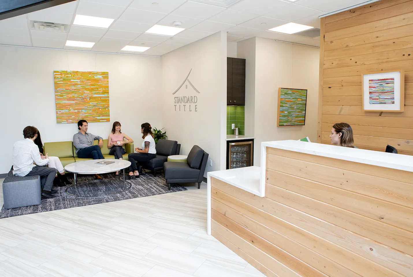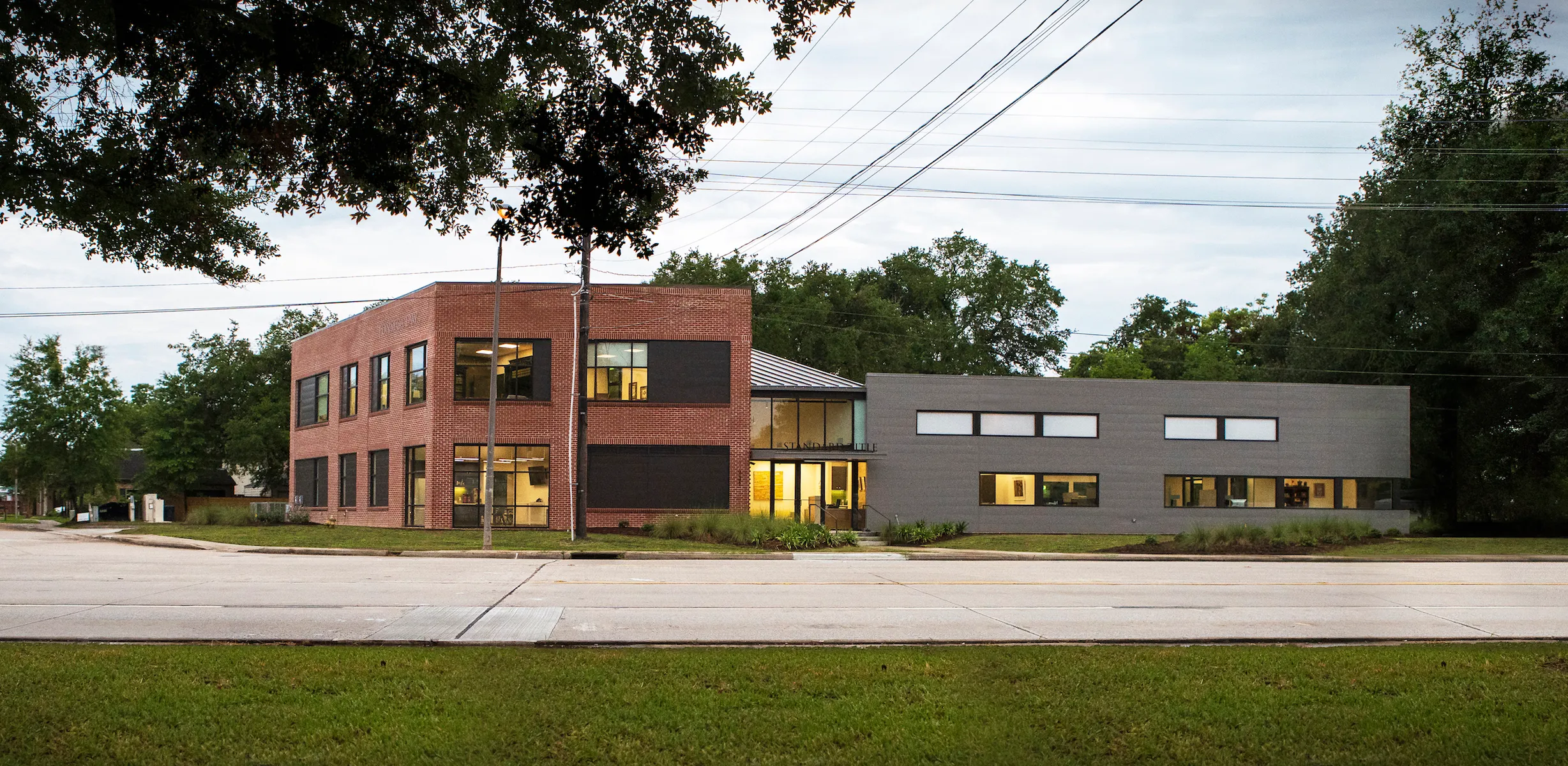 The new office building is located on a major roadway in Lafayette in a neighborhood that is transitioning from being suburban to urban. This produces a need to bridge from arriving by car or by foot. To accomplish this the building is sited on the street at the corner with parking and rainwater detention located on the interior of the block the two masses of the office building, one focused on the transactions of property closings, the other on the legal side of the business are places along the main road. The obtuse angle of the side street meeting the main road forces itself upon the design of the two story mass at the corner.