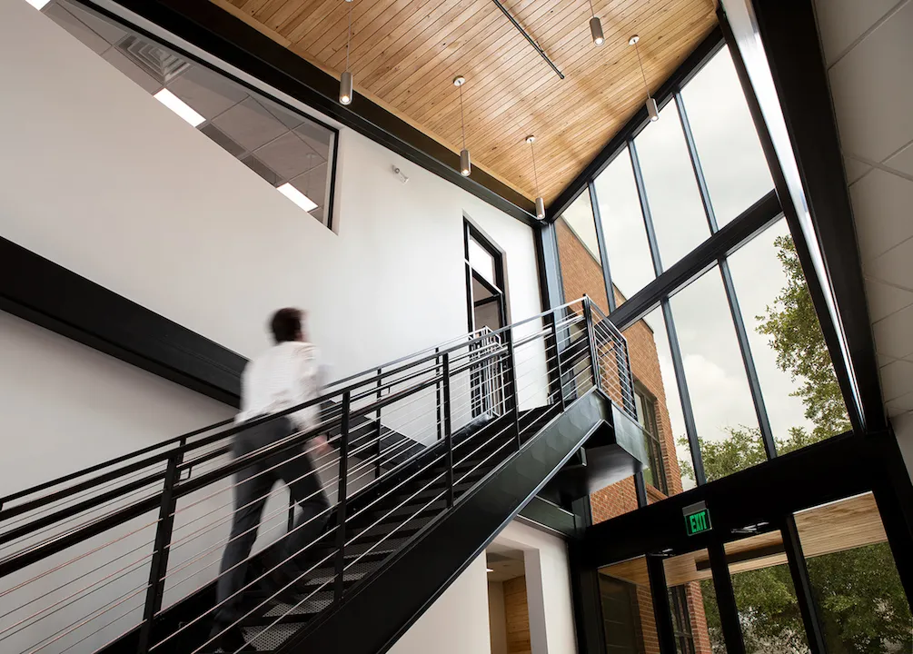 The stair in the entry atrium directs the user upward into the live oaks that were preserved on the property. This is where the angle first meets the user’s experience of arriving at a closing.