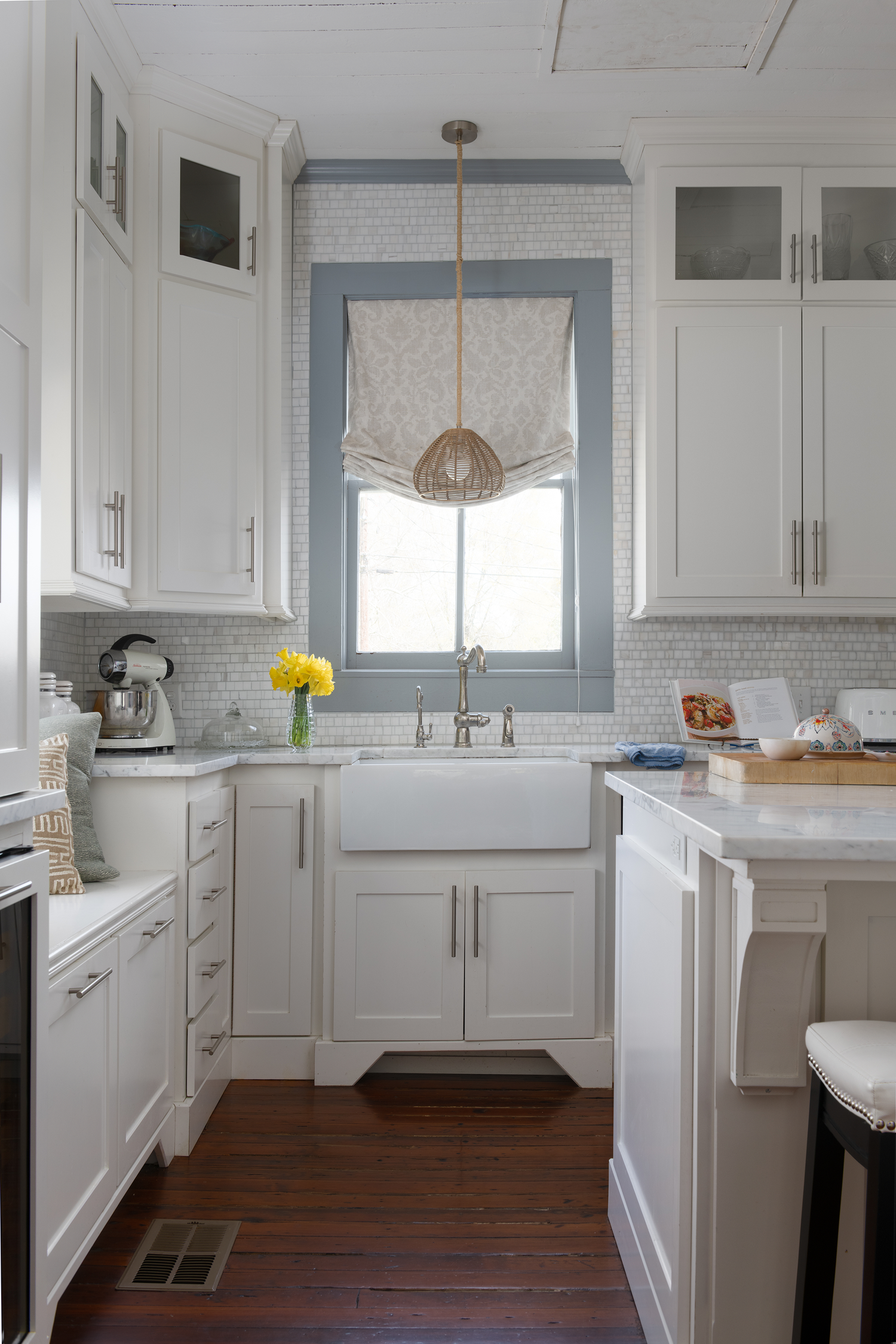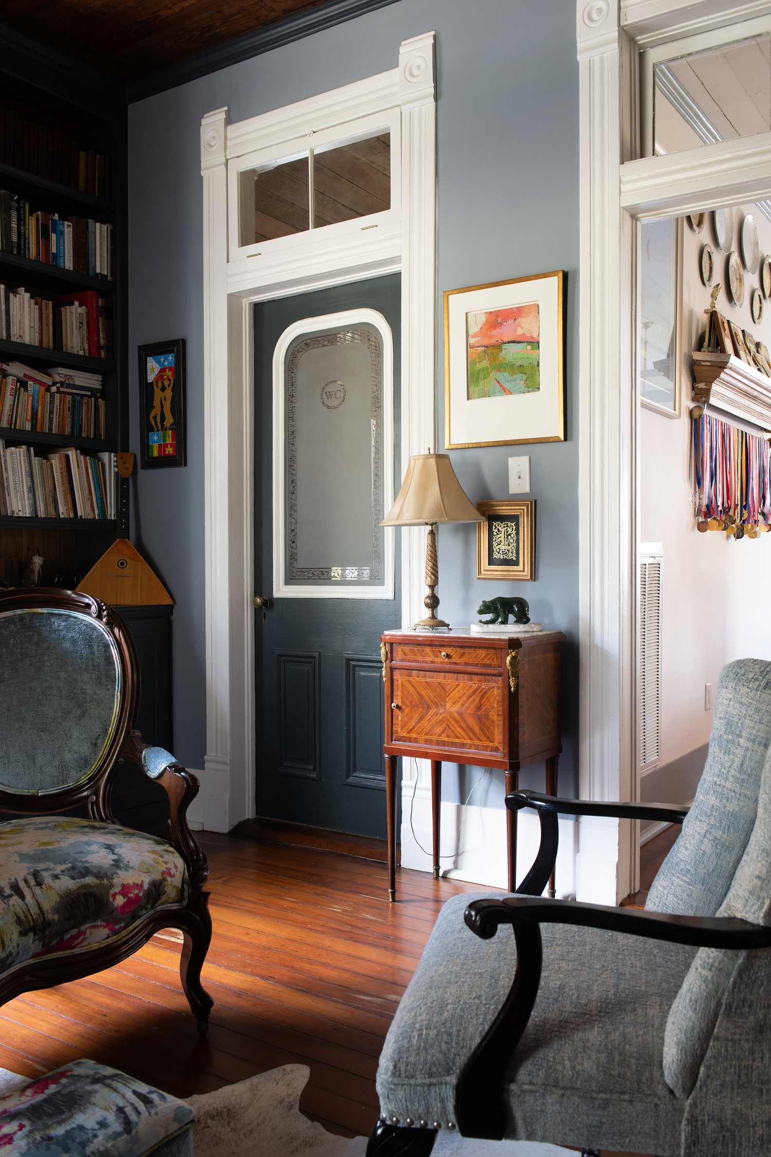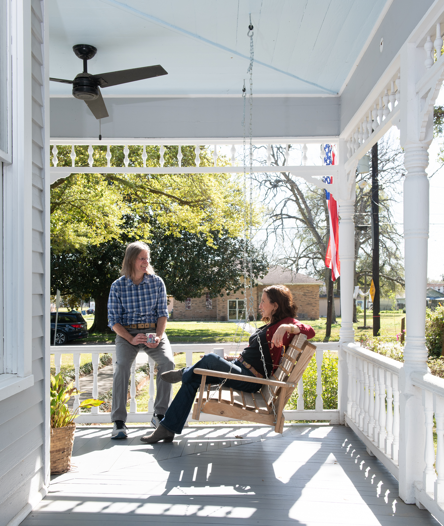 The clients chose a cool gray exterior paint color and white trim to accentuate the home’s gingerbread detailing. Though it originally had a 270-degree wrap-around porch, they reduced the porch’s footprint to 180 degrees to add more living space.
