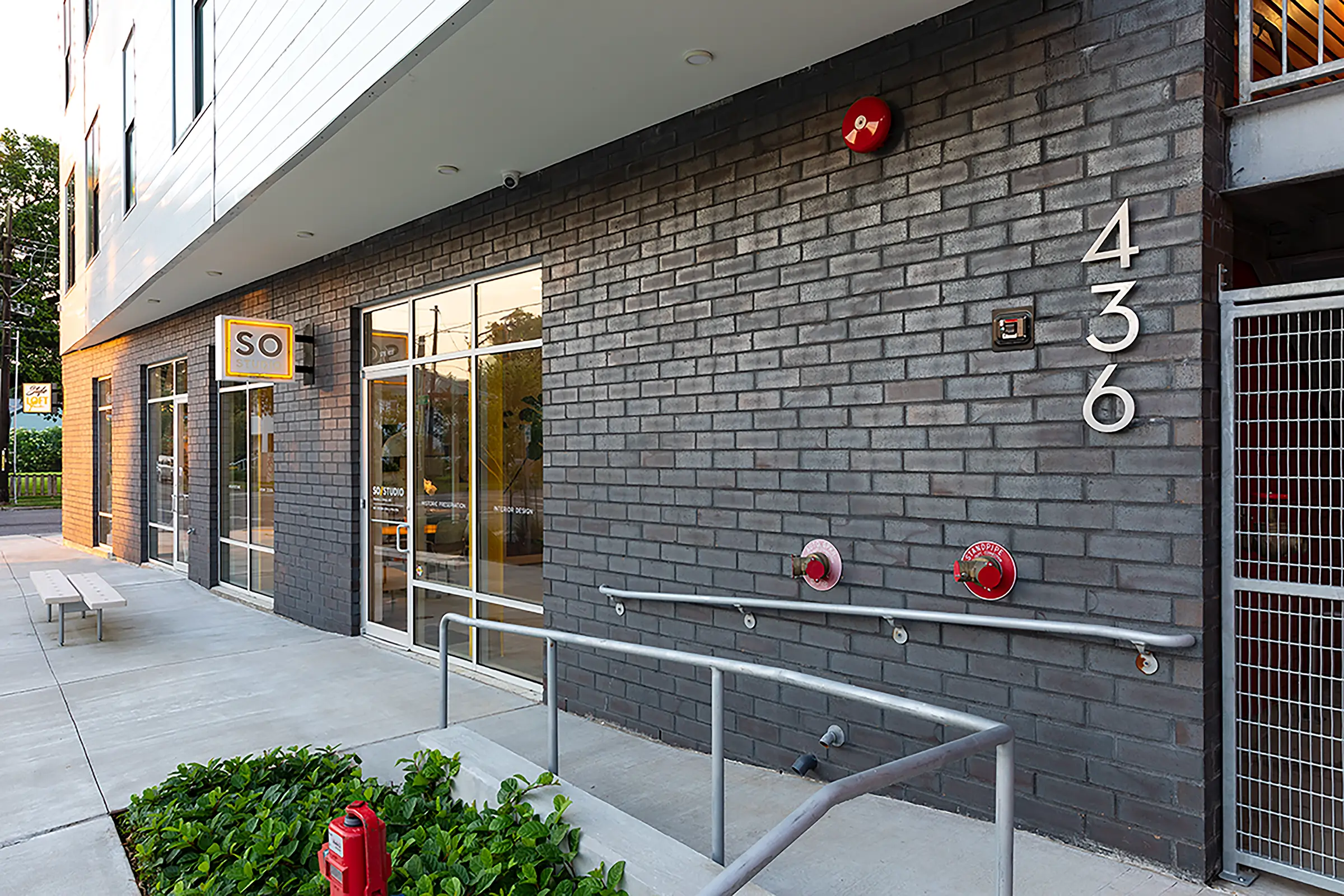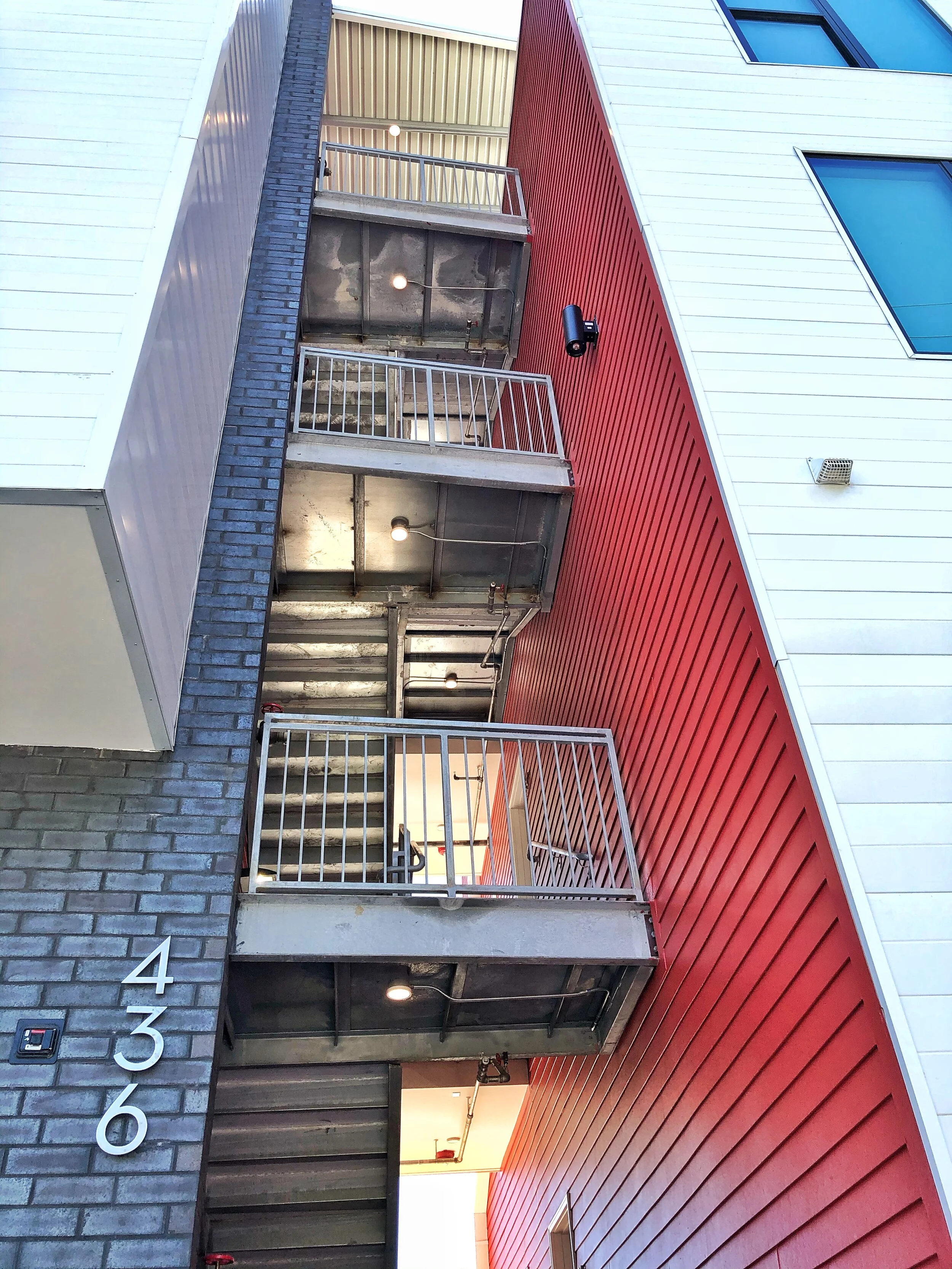 The upper dwelling mass is clad in white metal panels with hidden fasteners that mimic the wood lap siding buildings in the area, especially in the historic Freetown district across Johnston Street. The fenestration on this upper portion is darker, creating a contrast with the white panels. The commercial spaces and the open stair are clad in large dark gray bricks with aluminum storefronts and aluminum-coated stairs and gates.