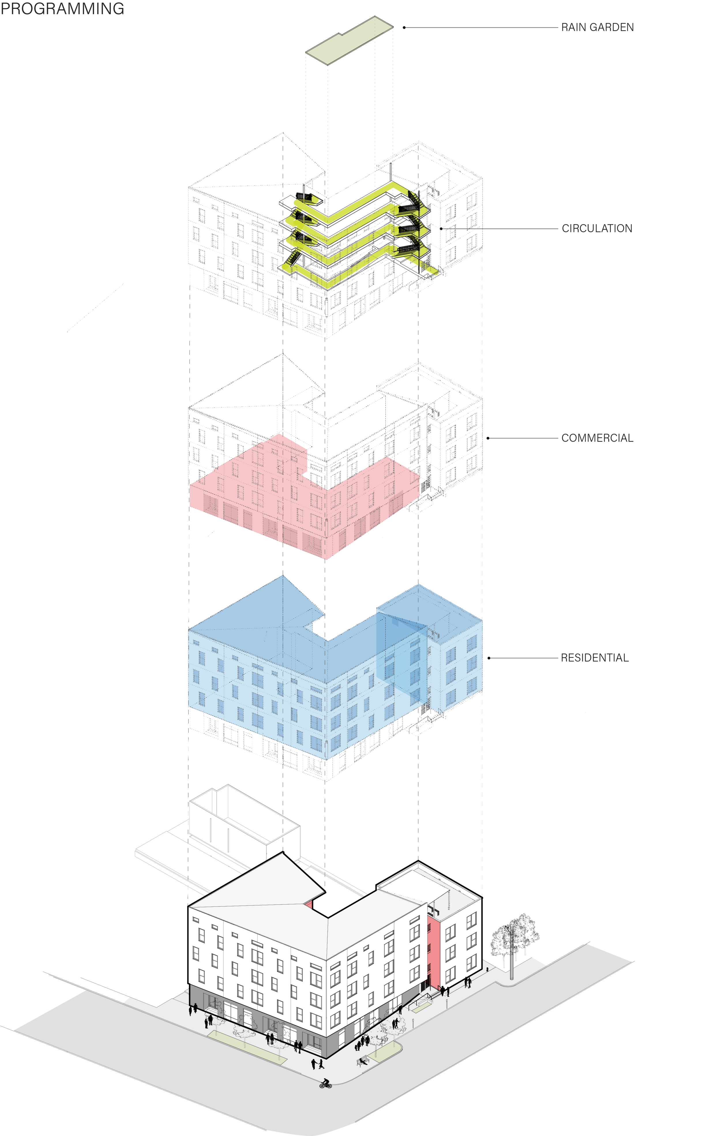 This mixed-use building for downtown Lafayette sits at a significant gateway point into the downtown district and the national historic district of Freetown. The twenty-four dwelling units are designed as a mass that is being fractured into two by one of the stairs, and then one side is lifted and filled in by commercial space. The side that is left at ground level is then used for accessible dwellings while the program of the commercial space and the exterior stair is left more porous than the dwellings, revealing the sculptural quality of the building.