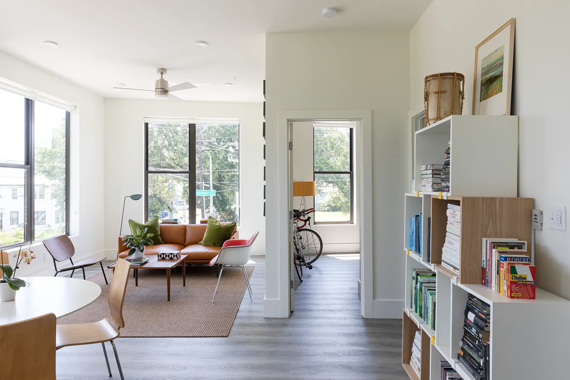 This mixed-use building occupied a key gateway in Lafayette that links downtown and Freetown with housing, retail, and a sculptural split form.